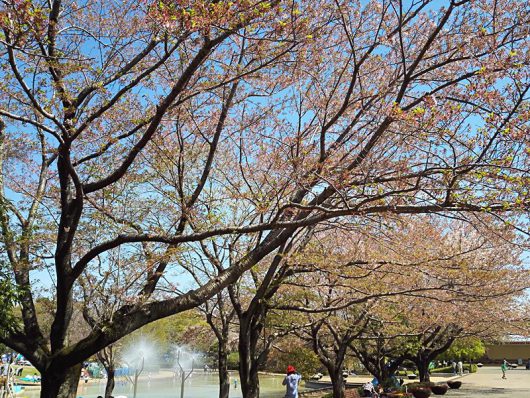 すでにワンパク王国エリアの芝生広場はサンシェードがたくさん並んでいて夏のような光景になっています。水辺も子供たちがたくさん遊んでいます。
